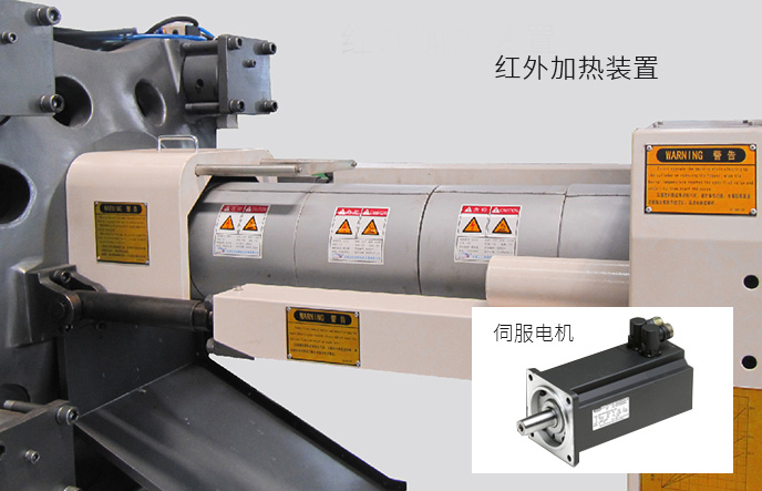 伺服驅動器在鎖模保壓冷卻等階段能輸出最大壓力但保持速度接近零速,因而功率消耗小,更節能 料筒采用納米遠紅外高效節能加熱裝置,改善了傳統加熱圈電熱轉換效率低、熱傳導率低、表面溫度高“兩低一高”缺點,比傳統加熱圈節能30%-40%